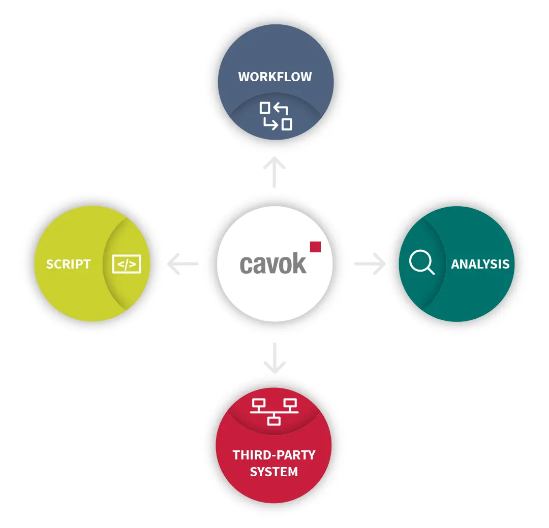 The core of the system is lean and fast. For customization, you have basically every option available on your server's operating system - scripts (Perl, Bash, PHP, Javascript, etc.), integration of libraries or command line tools, other apps, web services and much more. In addition, Cavok can be expanded with a REST interface that covers basic functions and can be expanded if necessary.